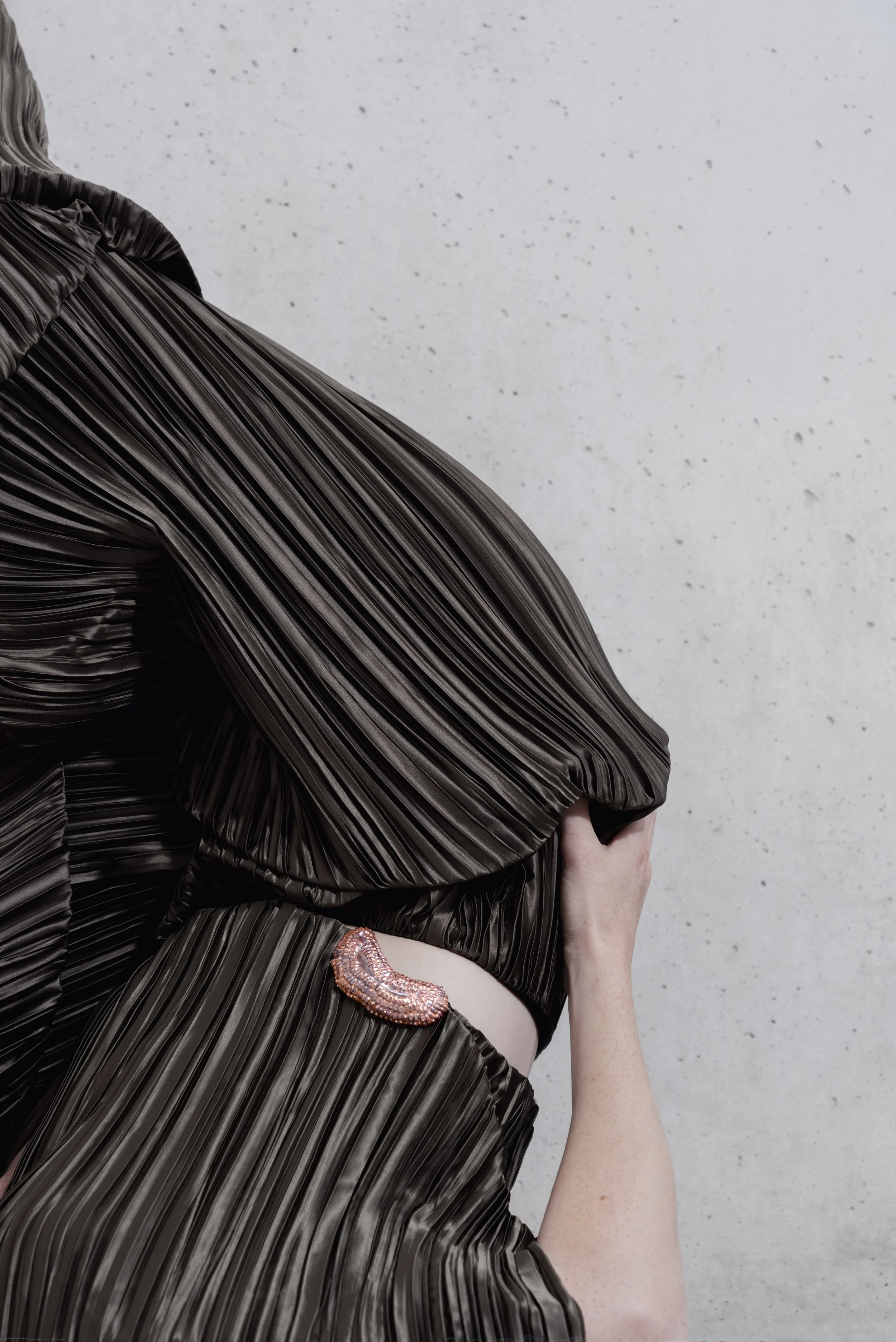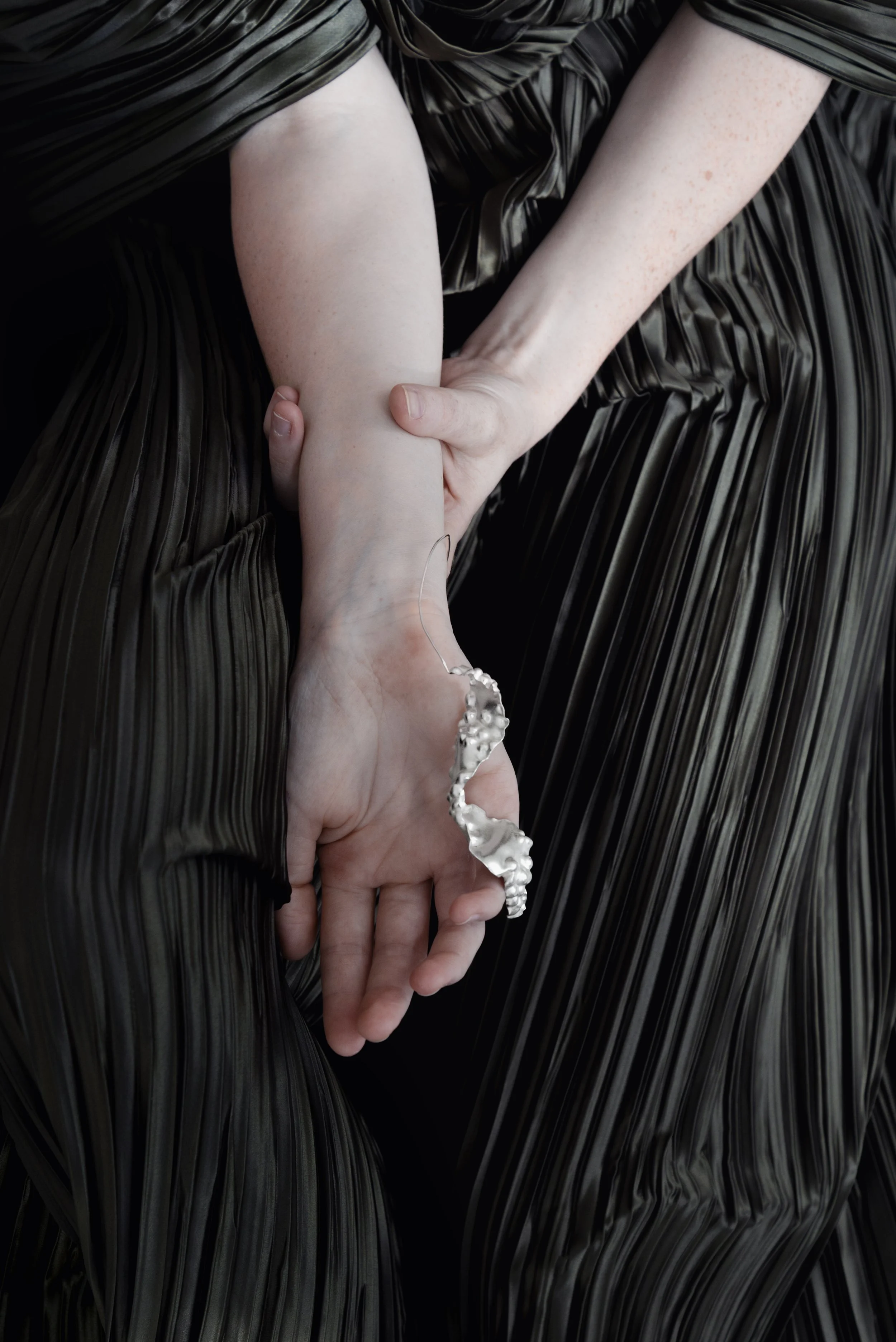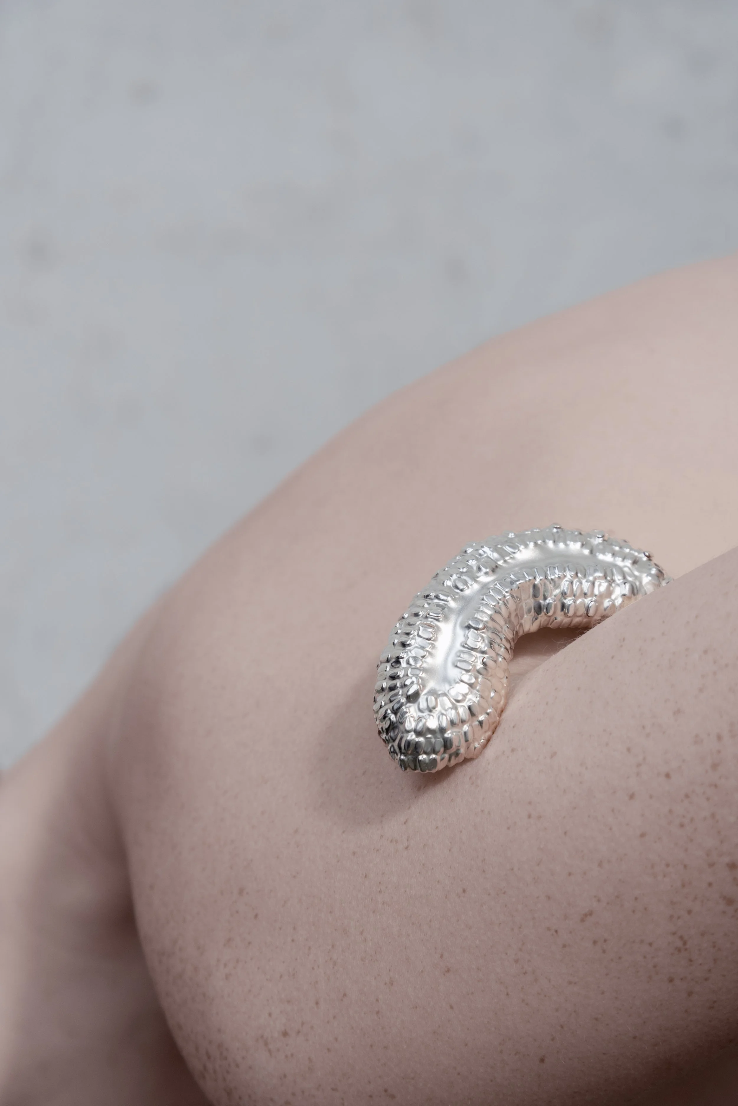 The detail of the structures reveals the aesthetics of the surface between order and chaos. The series of unique pieces parasitos is a sensitive examination of parasitic organisms that form connections with their carriers in various ways – a fusion defined by dependence. The work centres on the delicate shape of the creatures, which is hidden from the human eye. Through traditional forging techniques such as chasing and hallmarking, upsetting and driving the metals, a translation of natural formations into solid materials takes place – a transformation allowing the hidden to become visible.